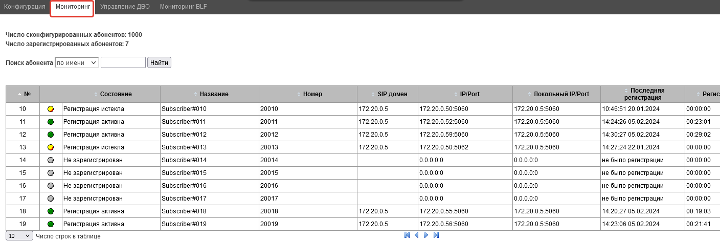 Интерфейс также позволяет просматривать состояние абонентов — в работе они или нет — используя вкладку «Мониторинг»: