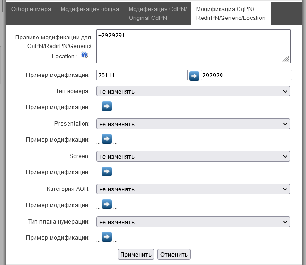 Модификаторы изменяют значения вызывающего (CgPN) и вызываемого (CdPN) номеров по определённым условиям. В нашем случае смысл в следующем: при входящем звонке вызывается городской номер, например, 292929, но в нашей АТС такого номера нет — в номерном плане не найдется соответствия, вызов будет отбит по причине «номер не существует». Нам нужно, чтобы вызов на 292929 поступил на внутренний номер 20111, для этого в модификаторе мы заменим CdPN (вызываемый номер) с 292929 на 20111. Также при обратном вызове с внутреннего номера на внешний провайдер должен видеть вызов с 292929, а не с 20111. В этом случае мы заменим значение в поле CgPN (вызывающий номер) с 20111 на 292929.