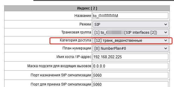 Если с разрешениями для абонентов всё просто, то настройка на стороне транков и префиксов требует пояснения. Первый способ ограничения доступа — назначить категорию доступа на SIP-интерфейс: